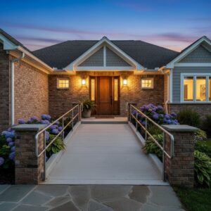 A gently sloped ramp, sturdy handrails, and good lighting are core accessible home modifications at any main entrance.