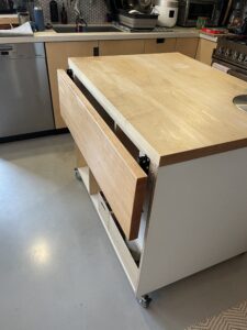 A poorly installed island leaf can sag, bind at the hinge, or feel unsafe when someone leans on it. Because this island is on wheels, movement and shifting weight make support even more important. When done properly, a hinged leaf adds real usable space and blends seamlessly with the existing countertop instead of looking like an afterthought.