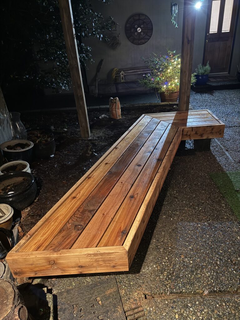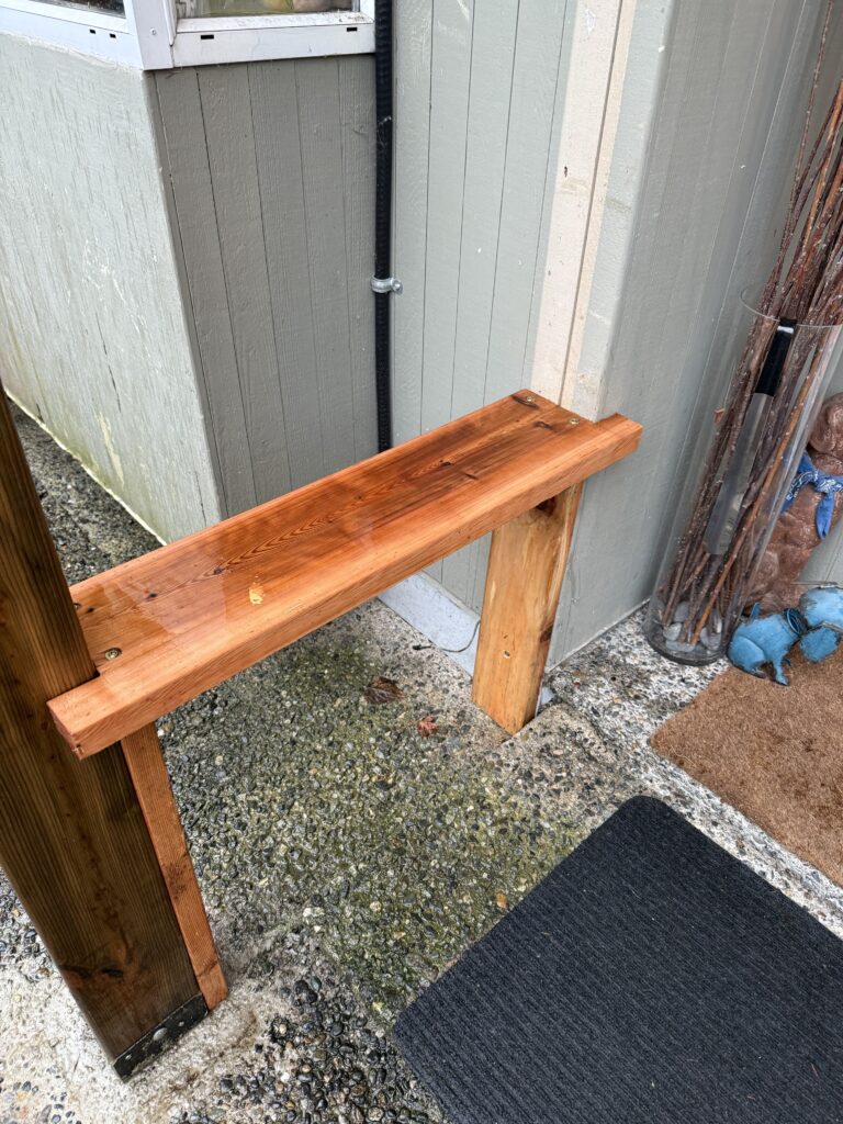 We’ll build a new bench base using pressure-treated 4x4s set in concrete. The bench will match the previous size and style, but the seat will be upgraded with cedar 2x8s laid flat with small gaps for water drainage. The sides will keep the same wrap-around 2×8 border for a finished look.