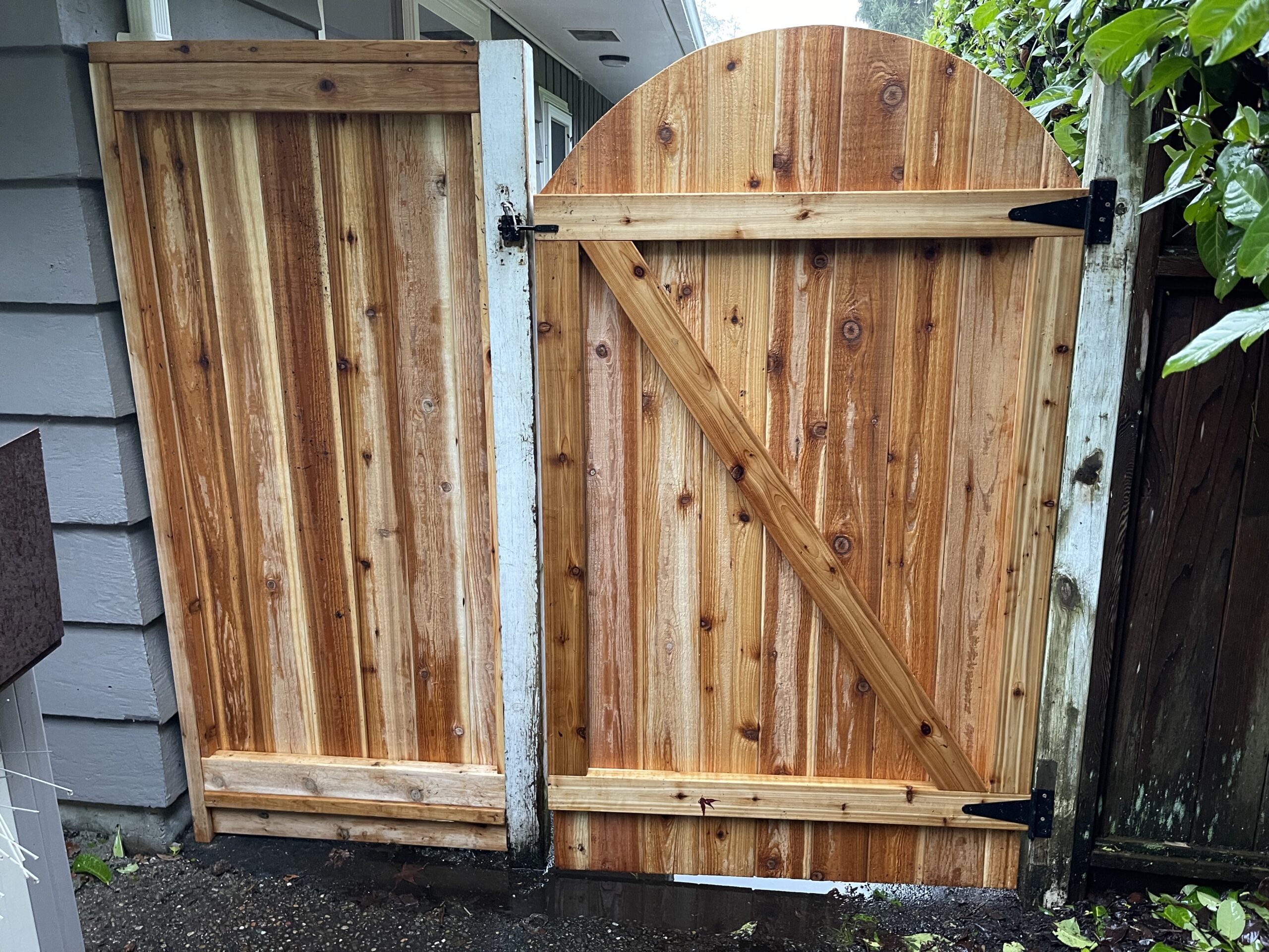 An aging garden gate and fence panel were removed and replaced with a new cedar design that provides strength, privacy, and a clean visual upgrade. The project included building a rounded top cedar gate, installing a matching 1×6 cedar fence panel, and securing everything with black exterior hardware for smooth function and long lasting durability. Once aligned and fastened, the entire entry was tested, cleaned, and finished to give this West Vancouver home a refreshed and inviting backyard entrance.