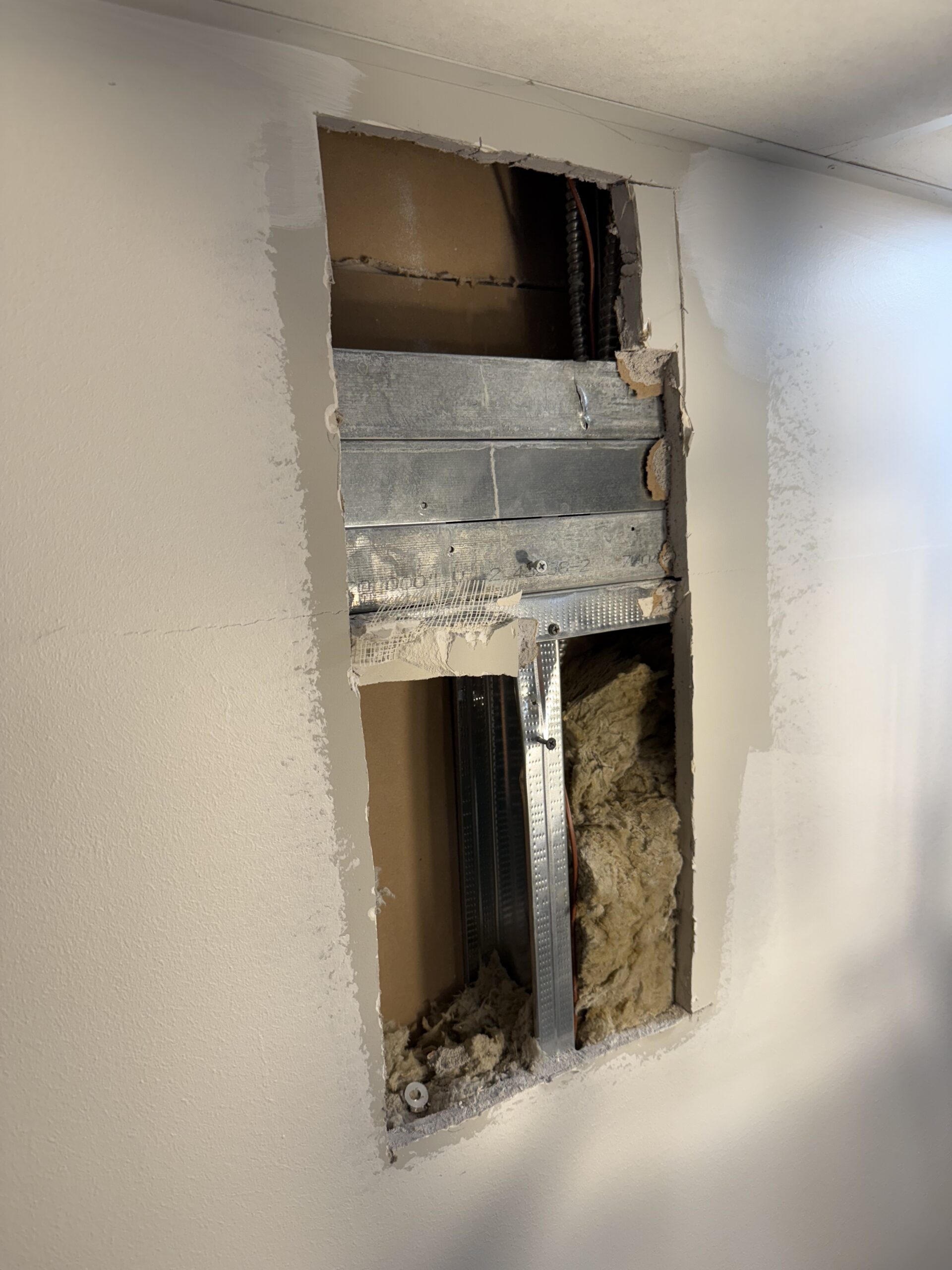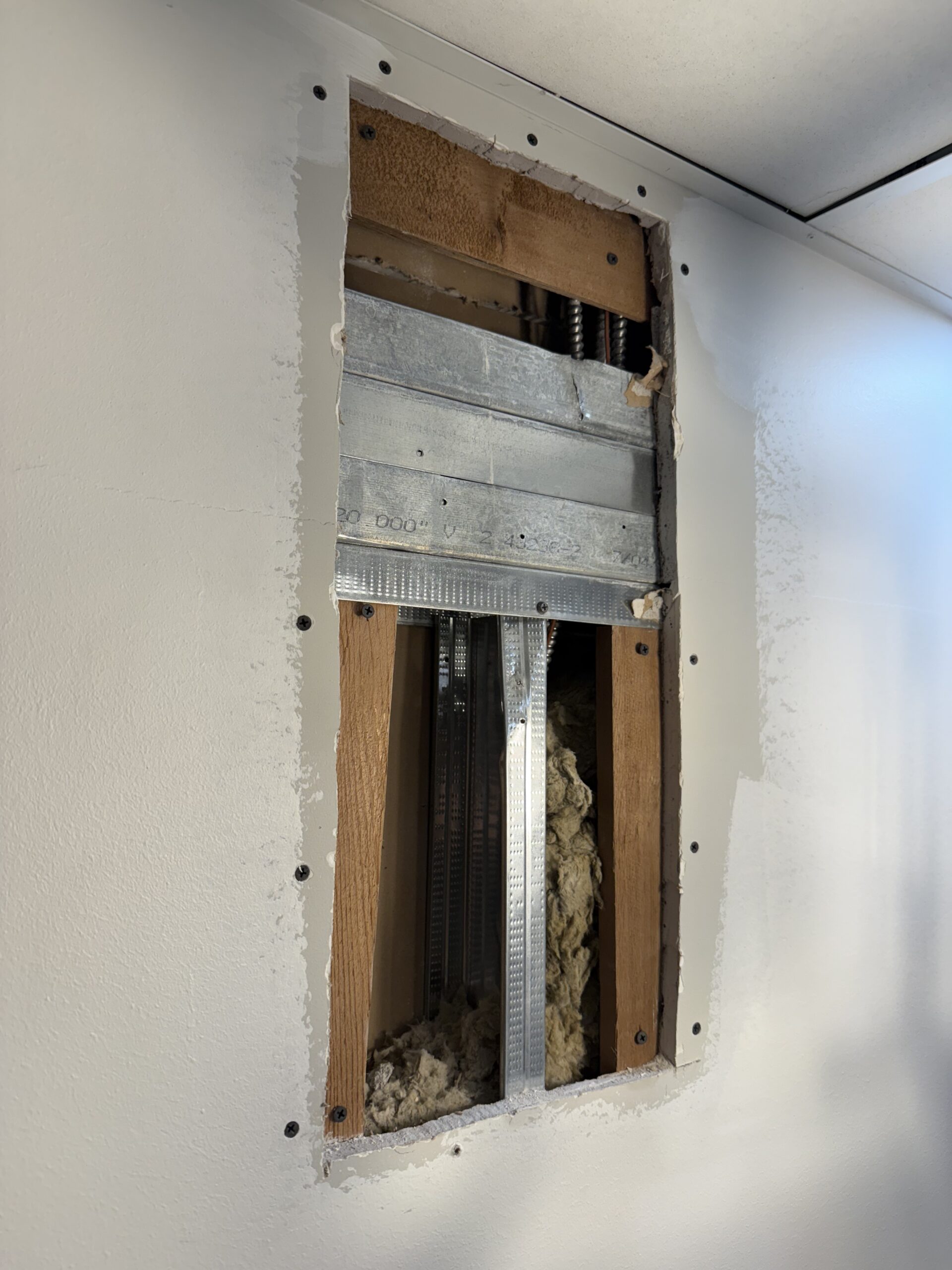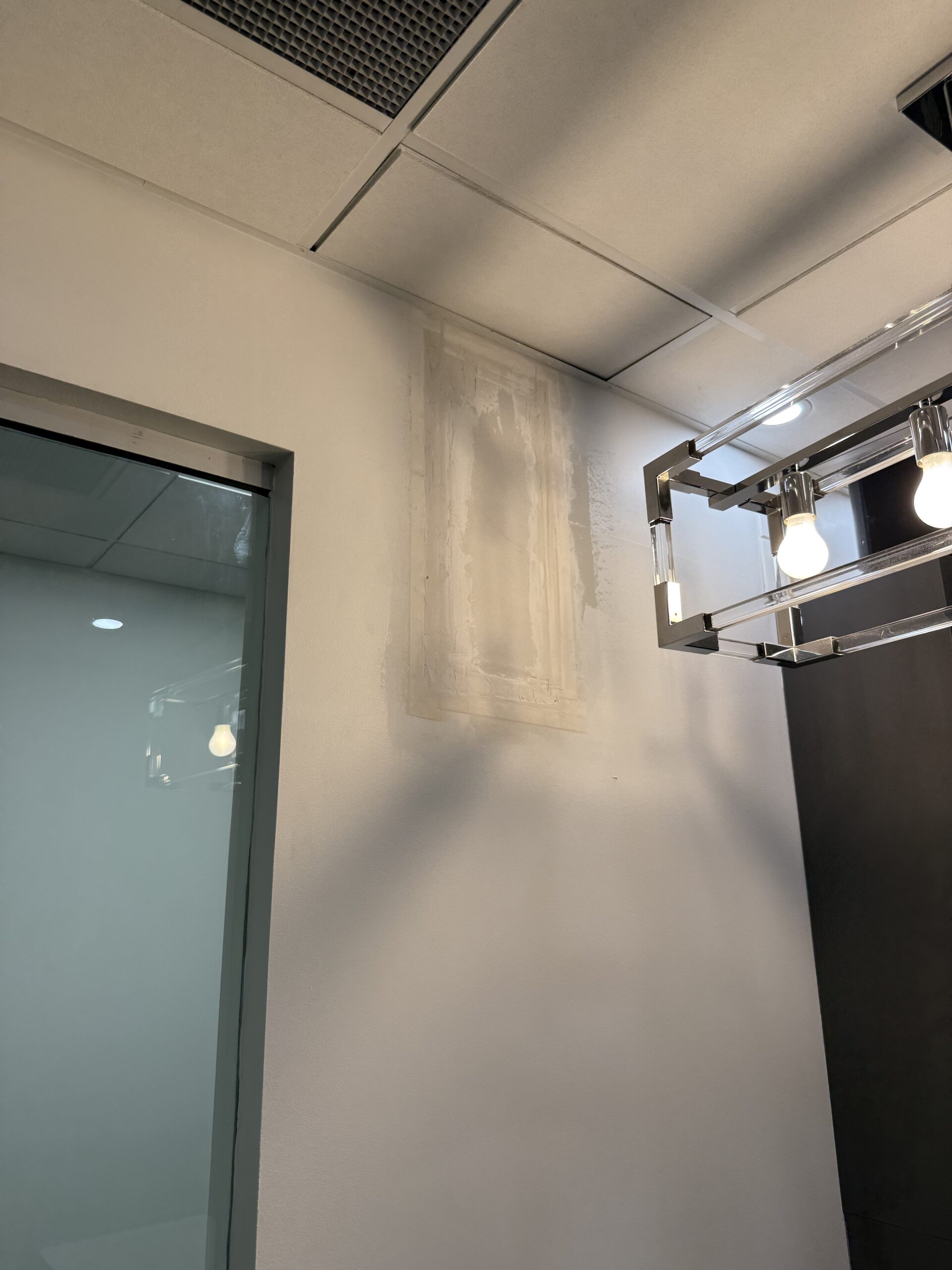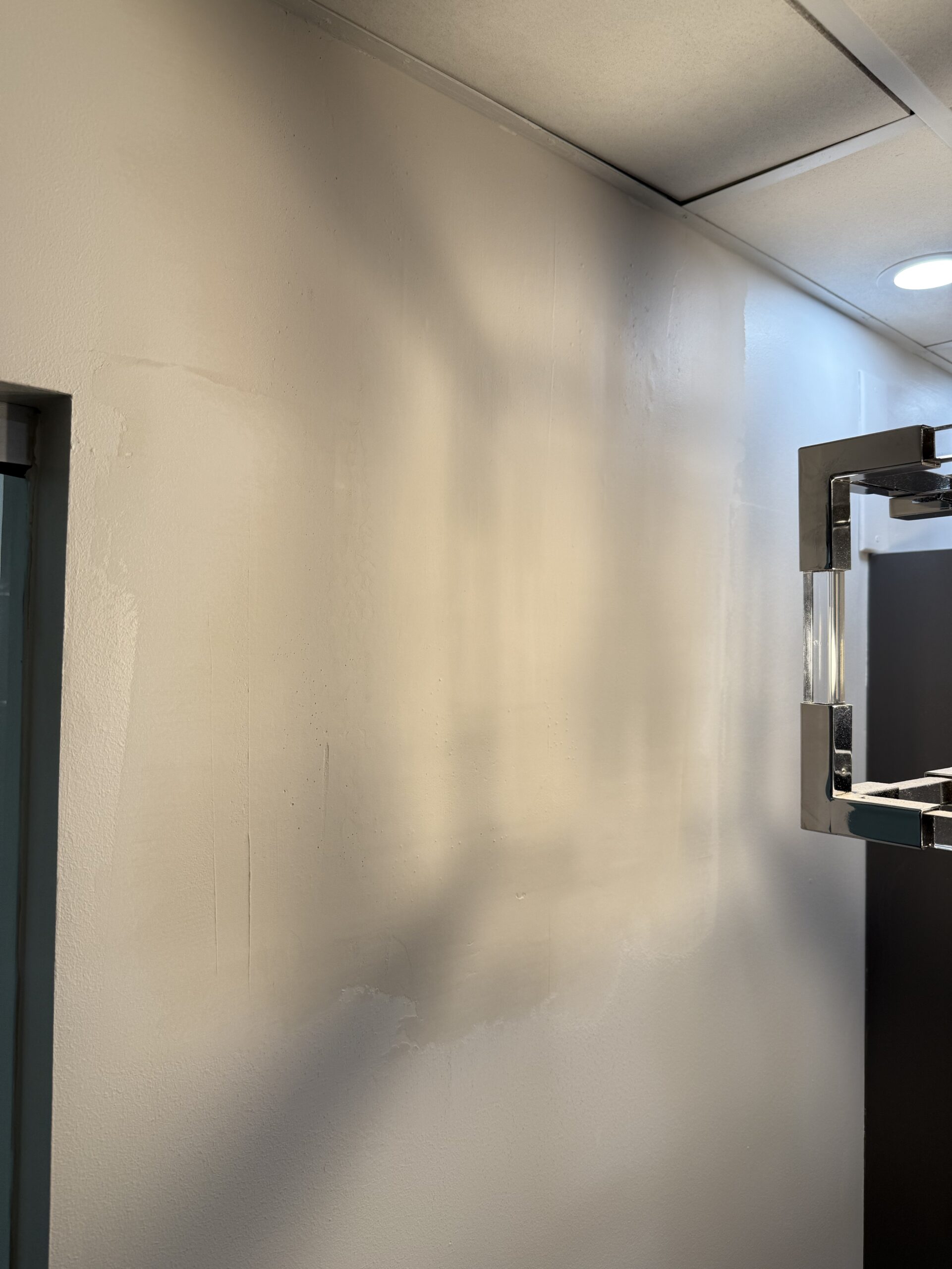 Drywall damage above a reception desk in a Vancouver office was repaired to restore a clean and professional appearance. The damaged section was cut out, cleaned, and reinforced with new backing before installing a matching drywall panel. The seams were taped and finished with multiple coats of joint compound, then sanded smooth for a seamless blend. The repaired area was primed and painted to match the existing wall, leaving the reception space looking sharp and ready for daily use. This project highlights our commercial drywall repair expertise for Vancouver businesses that need fast, clean, and reliable results.