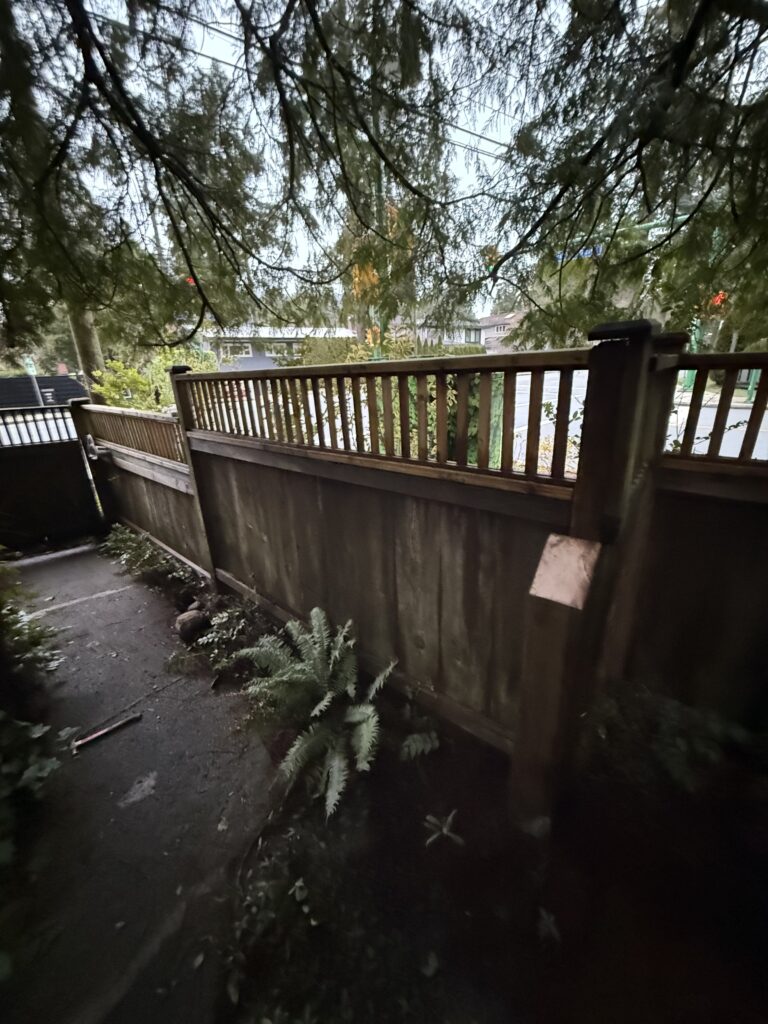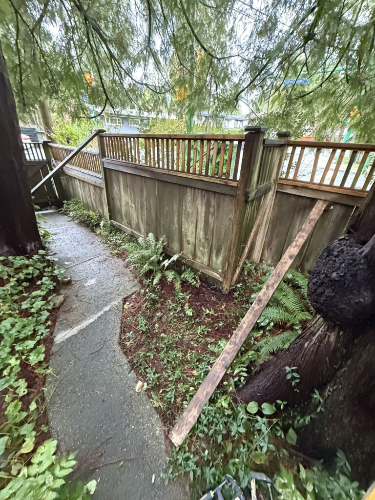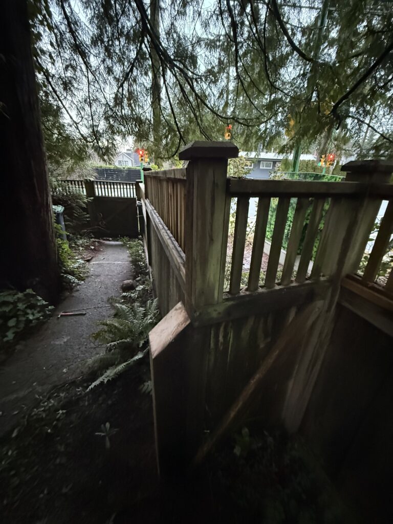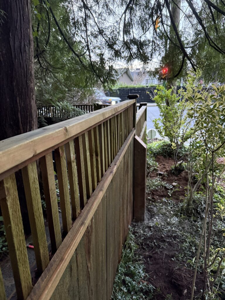 A sagging fence line is usually a sign the posts are drifting out of plumb and the load is no longer being carried correctly. For this street-facing section near the intersection, we kept the existing fence look intact and reinforced the structure from behind the scenes. We braced the line, excavated for proper footings, set new 6×6 pressure-treated posts in concrete beside the existing posts, and tied everything together with structural fasteners for long-term stability.
