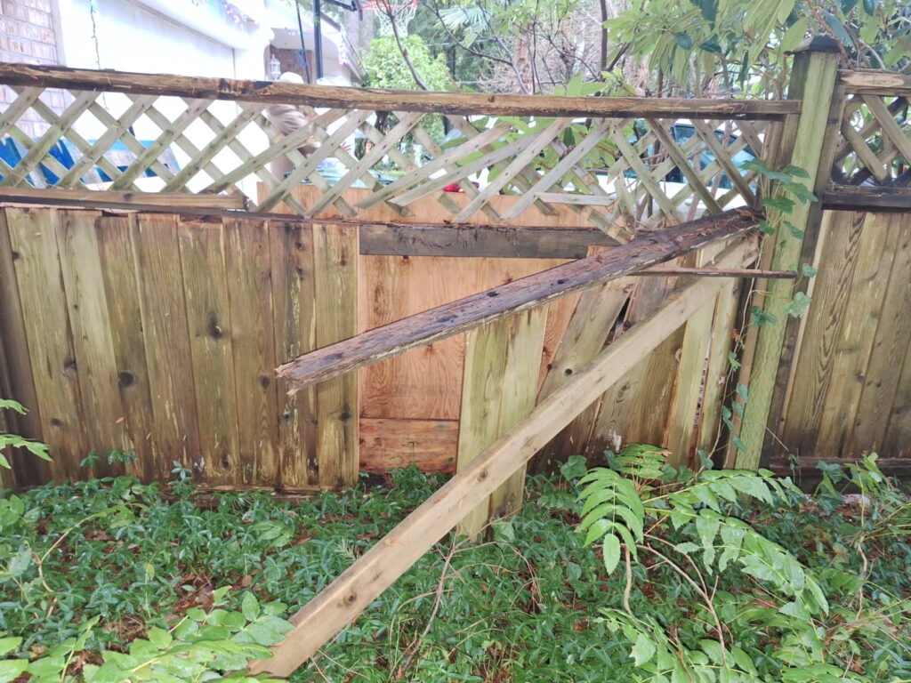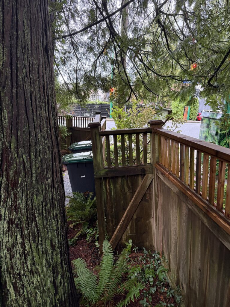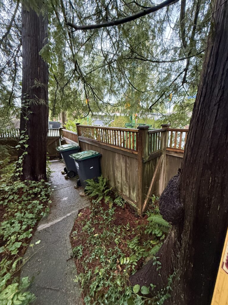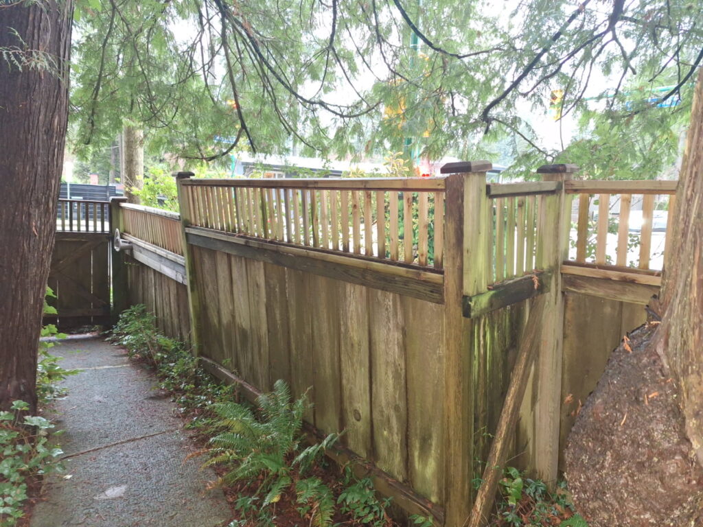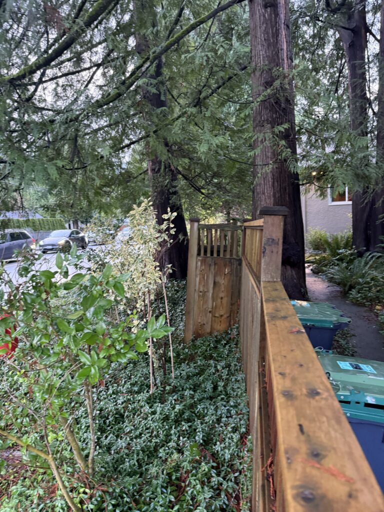 A sagging fence line is usually a sign the posts are drifting out of plumb and the load is no longer being carried correctly. For this street-facing section near the intersection, we kept the existing fence look intact and reinforced the structure from behind the scenes. We braced the line, excavated for proper footings, set new 6×6 pressure-treated posts in concrete beside the existing posts, and tied everything together with structural fasteners for long-term stability.