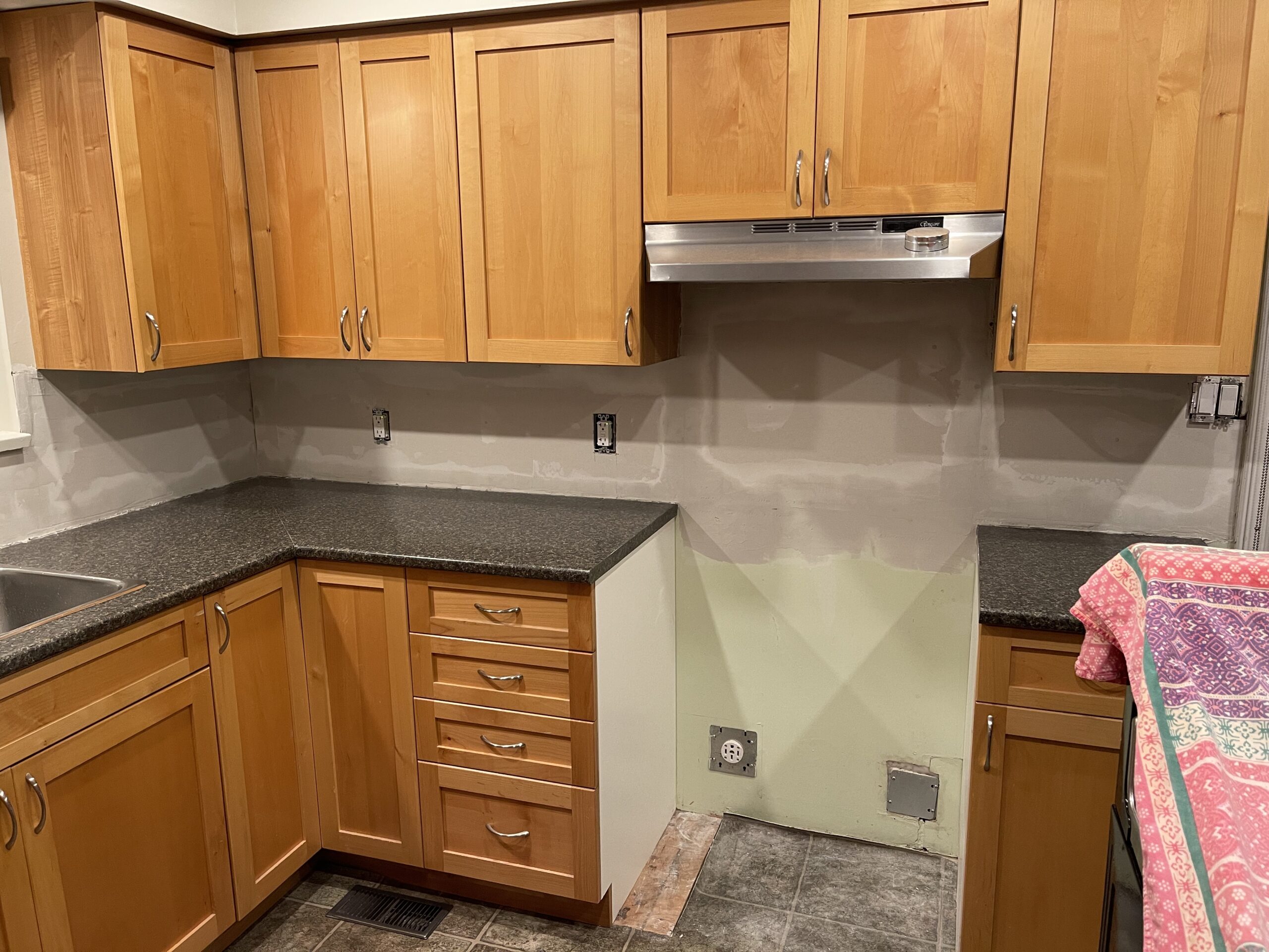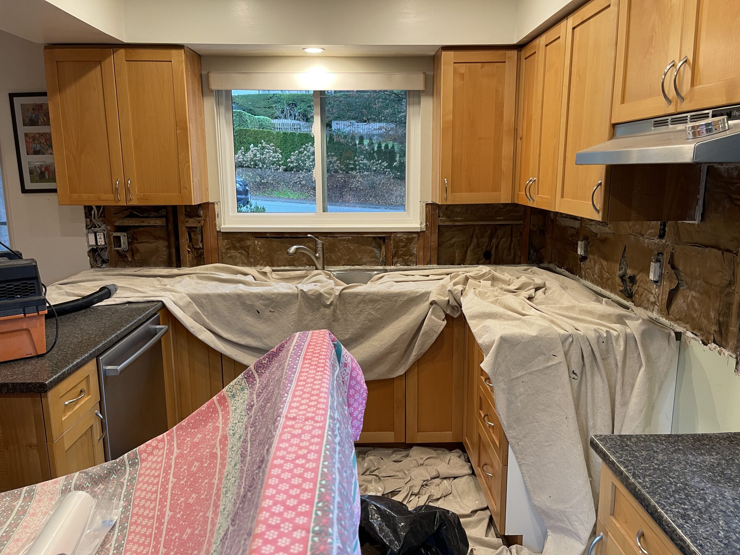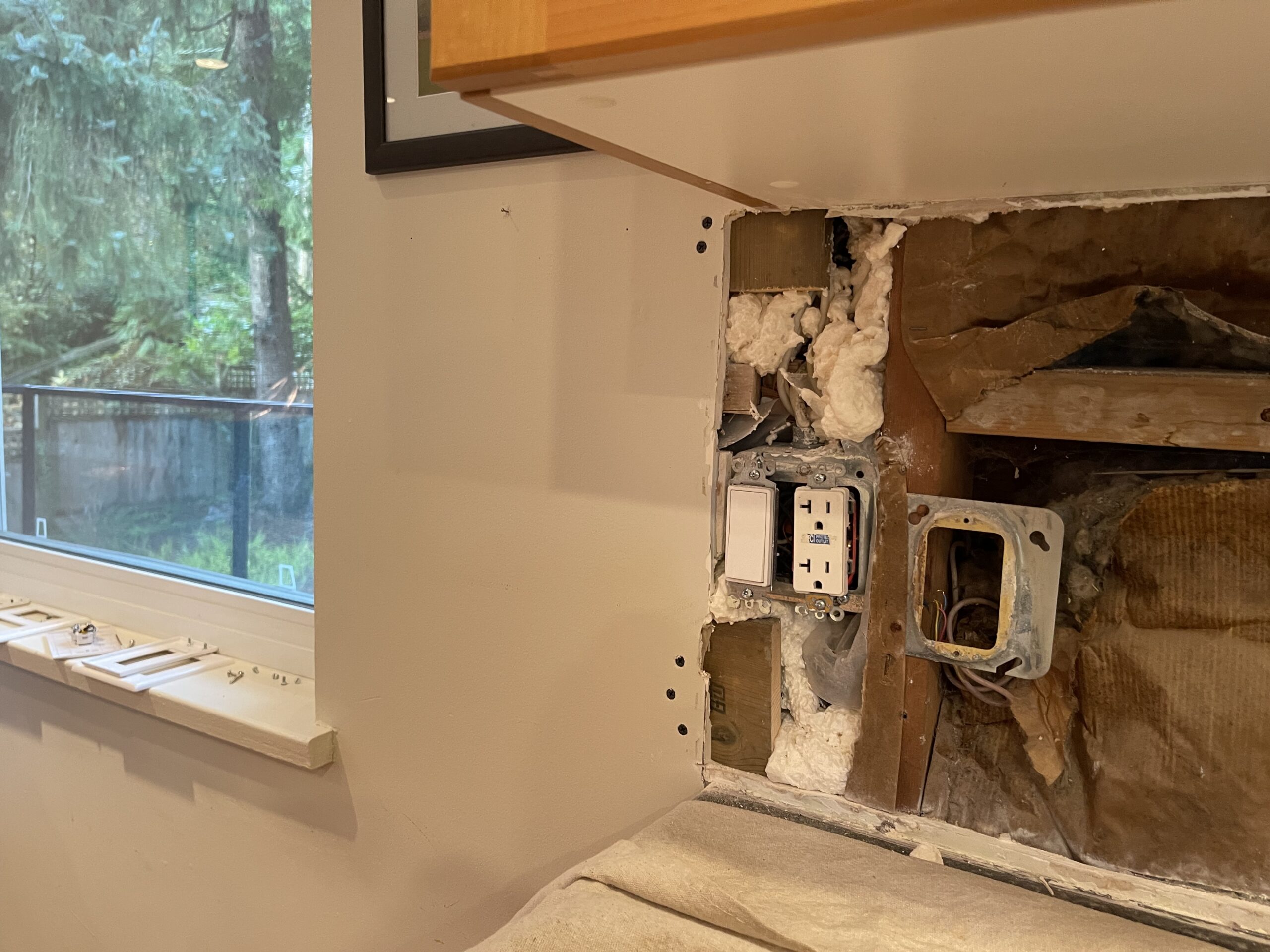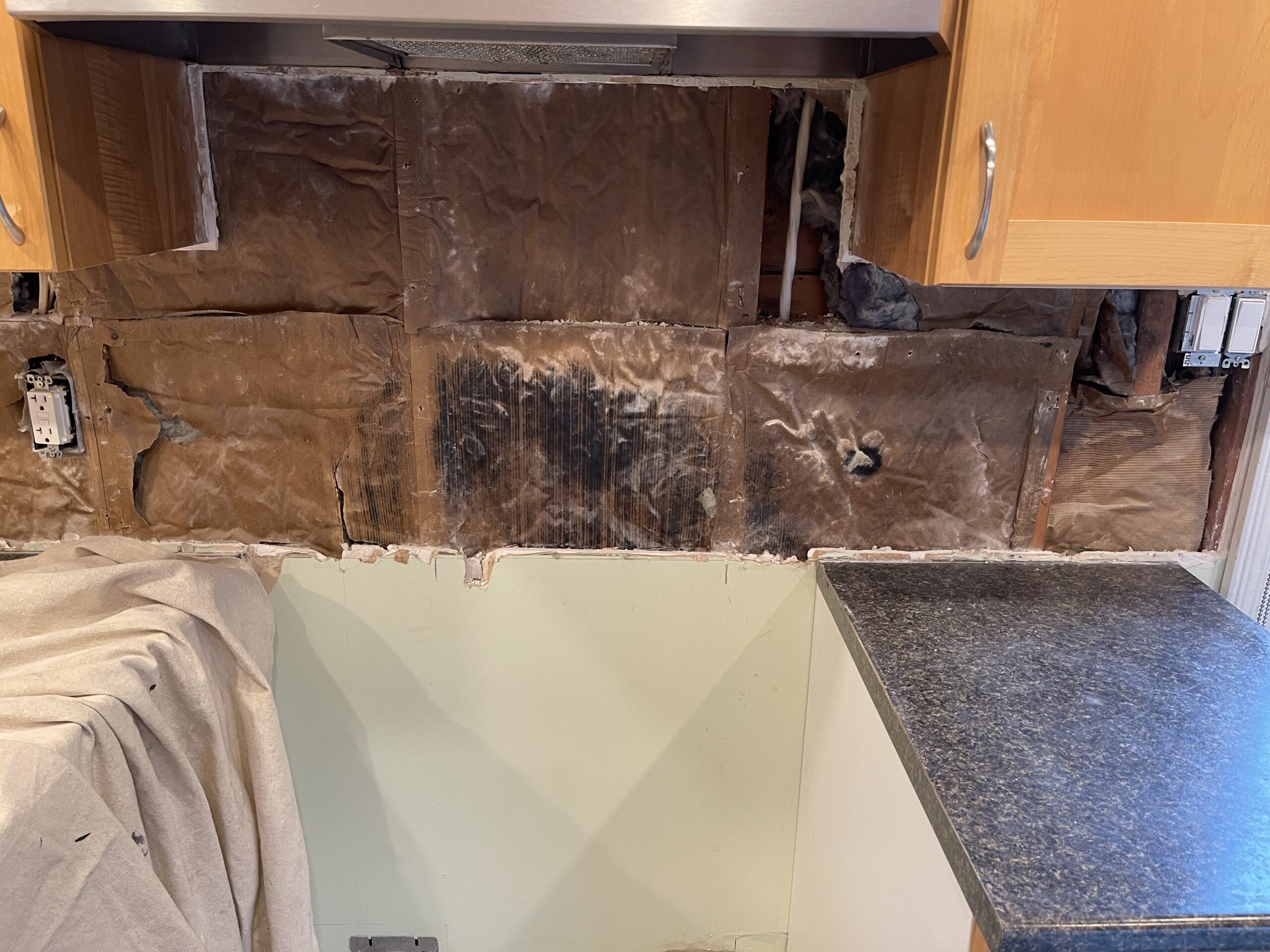 Damaged drywall behind the kitchen backsplash was removed and replaced with new half inch drywall to create a clean and level surface for countertop measurements. The vapor barrier was inspected and repaired with proper sealing tape, and the new drywall was fastened, taped, and coated so the wall is solid and ready for templating. The area was cleaned, primed, and prepared for the next stage of the renovation, leaving the kitchen tidy and ready for the countertop team.