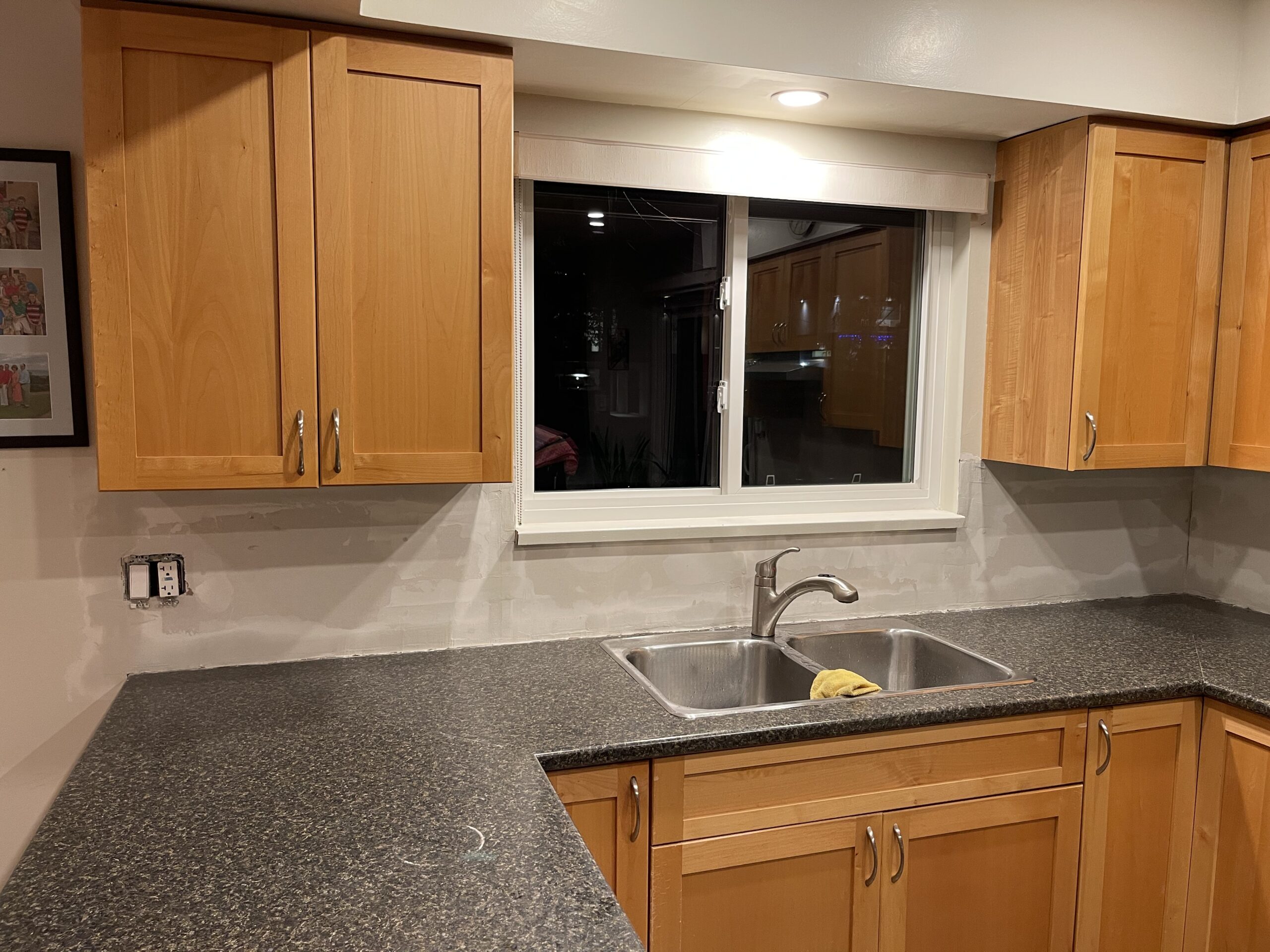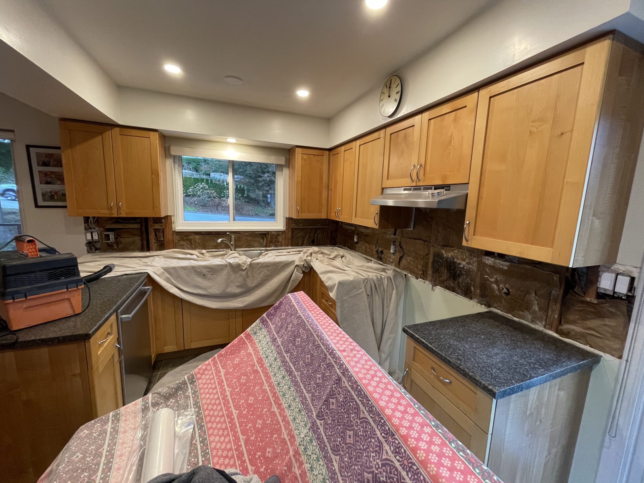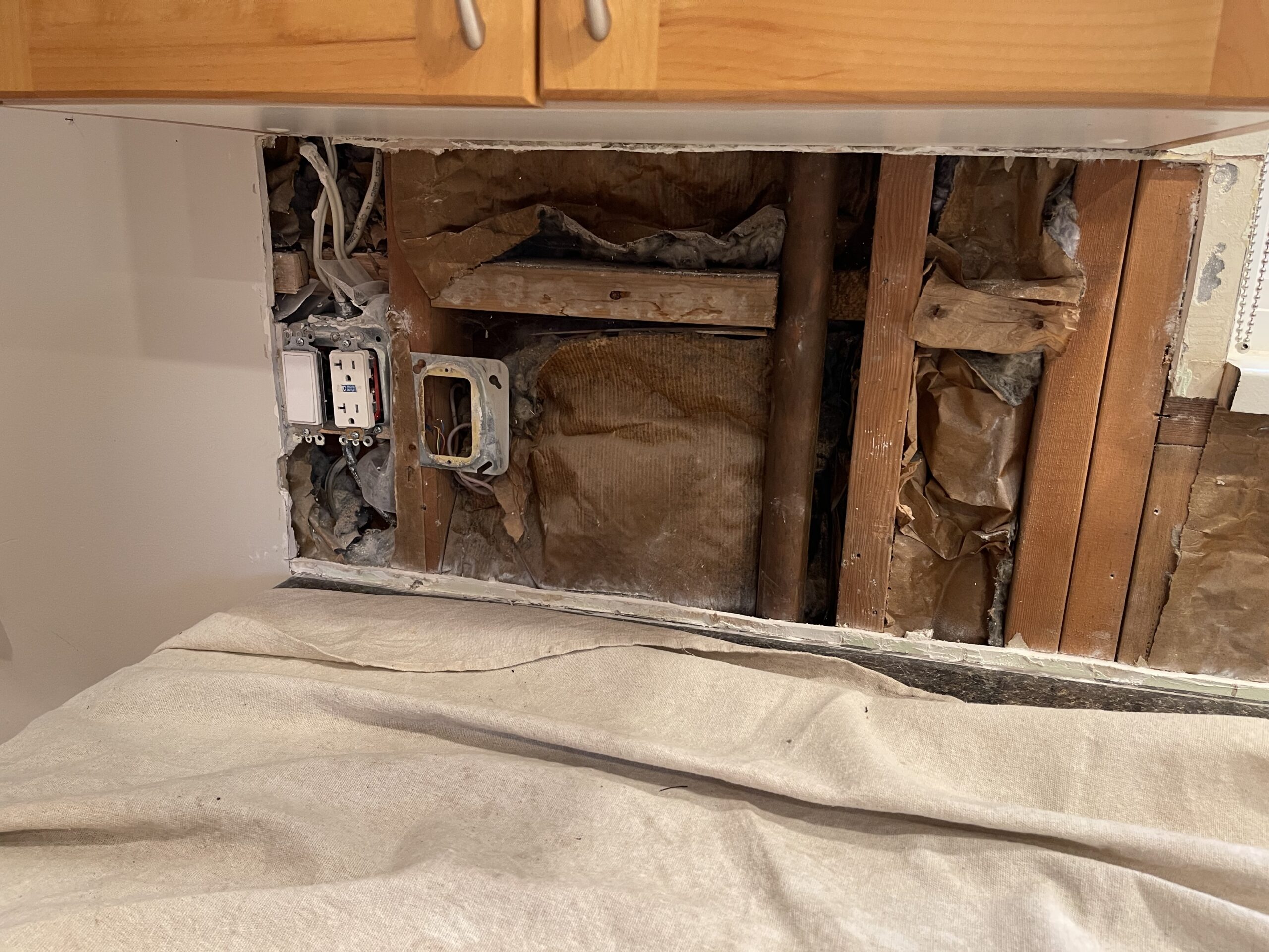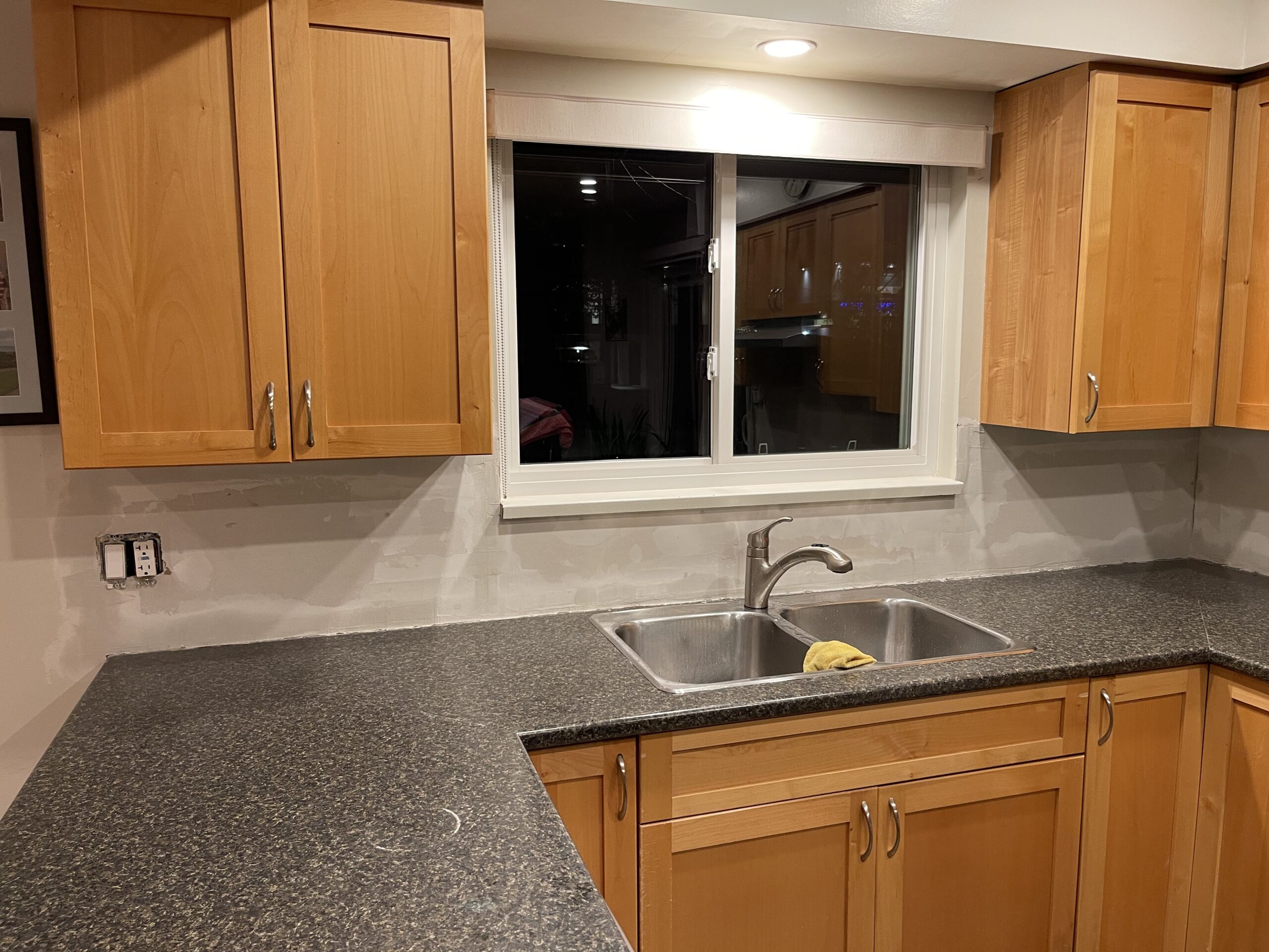 Damaged drywall behind the kitchen backsplash was removed and replaced with new half inch drywall to create a clean and level surface for countertop measurements. The vapor barrier was inspected and repaired with proper sealing tape, and the new drywall was fastened, taped, and coated so the wall is solid and ready for templating. The area was cleaned, primed, and prepared for the next stage of the renovation, leaving the kitchen tidy and ready for the countertop team.