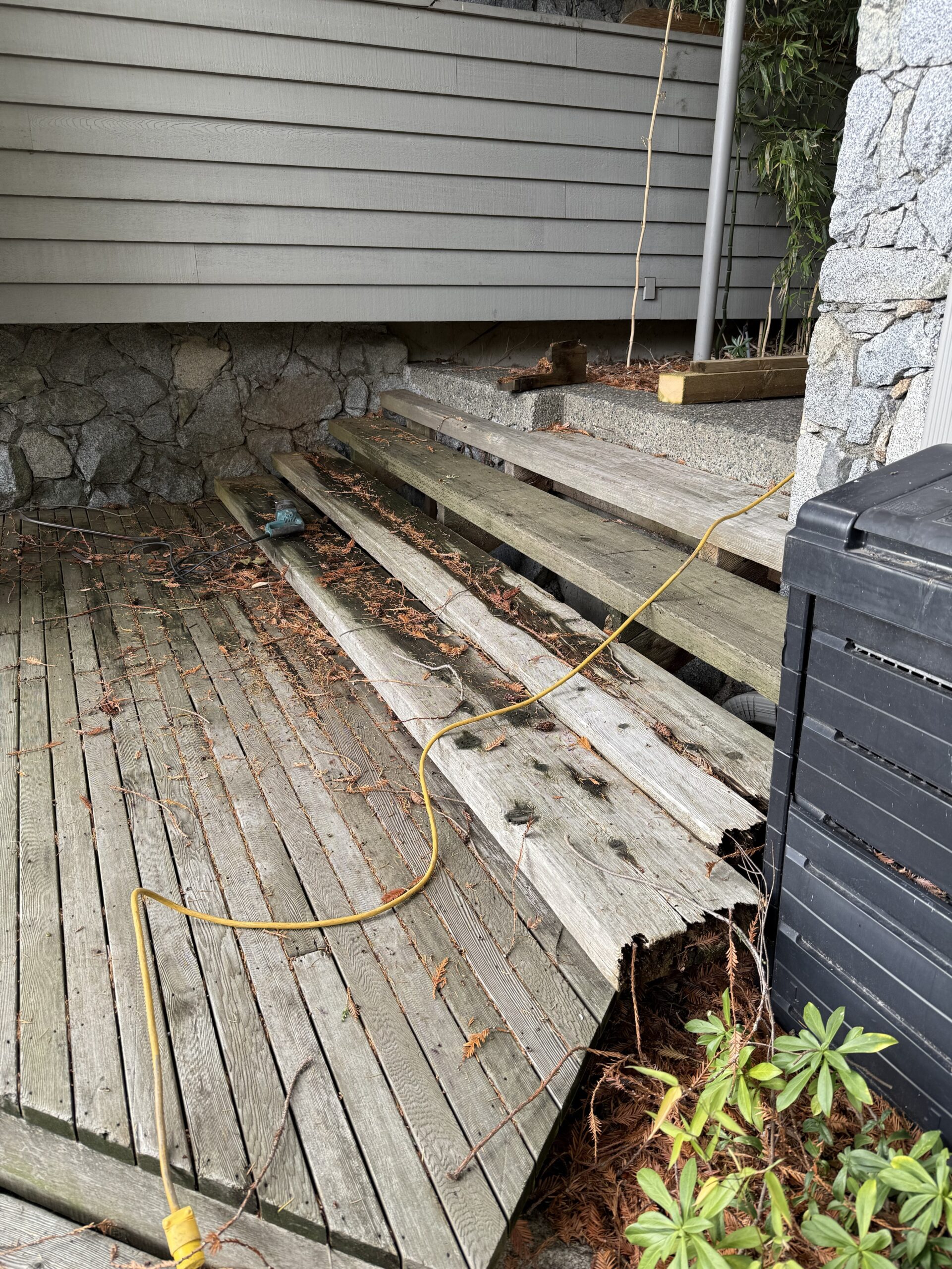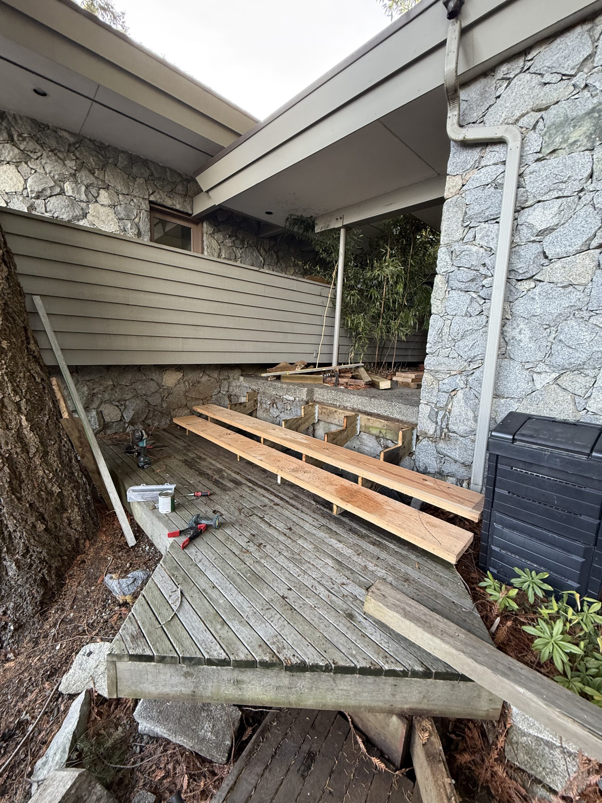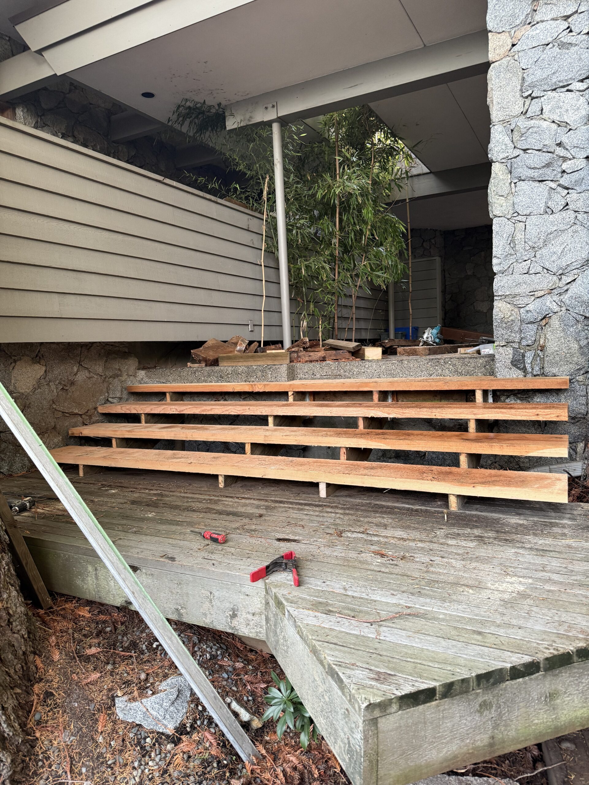 Old and rotted exterior stairs were carefully dismantled and rebuilt to restore safety and appearance. Damaged stringers were reinforced with new pressure-treated lumber, and all steps were replaced with solid fir planks sealed with an exterior-grade urethane finish for lasting protection. The finished stairs provide a stronger structure, smoother steps, and a refreshed look that stands up to Vancouver’s weather.