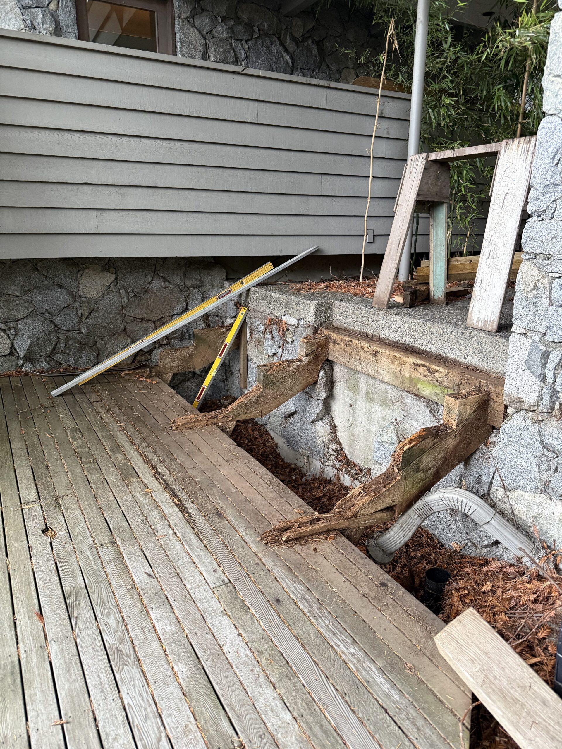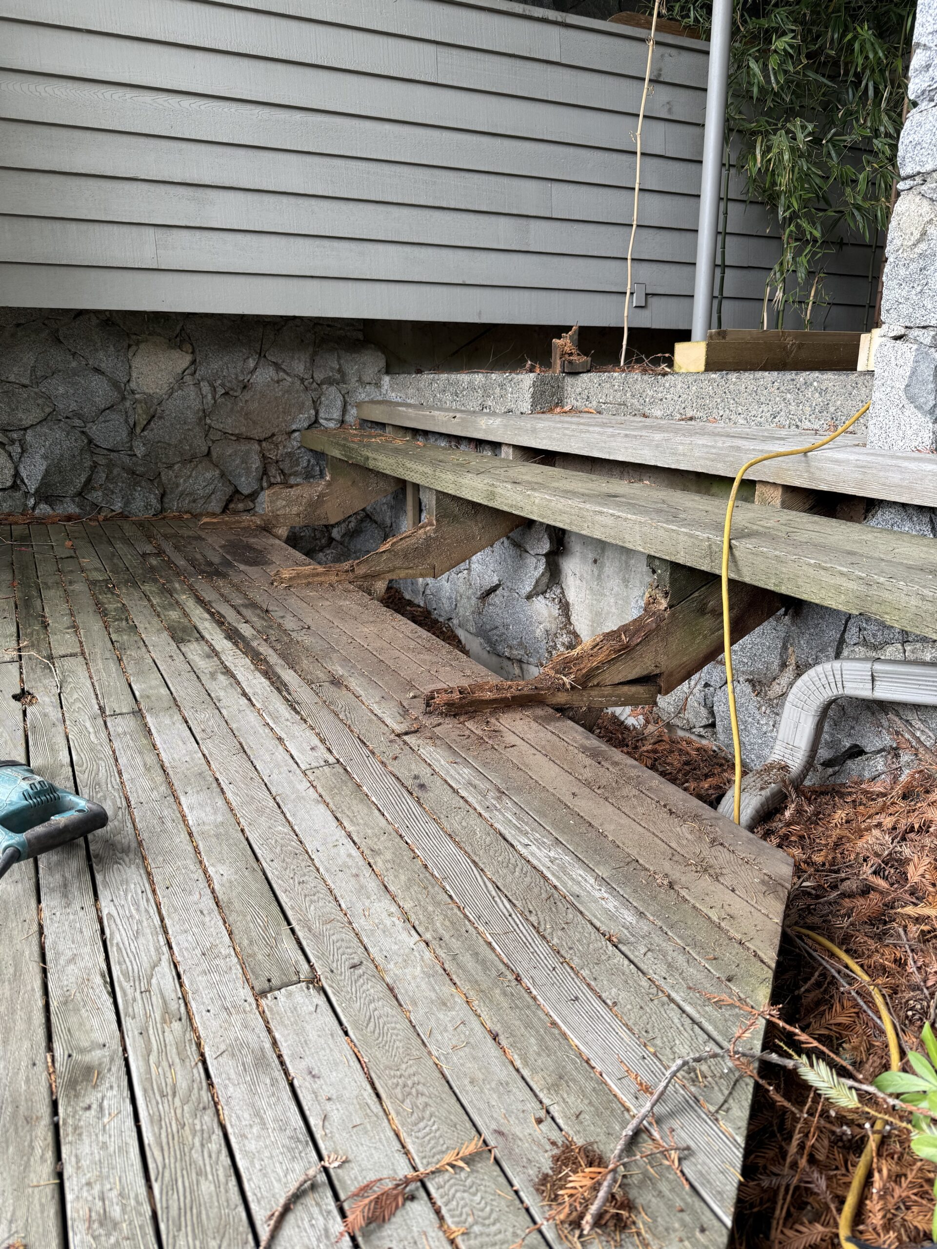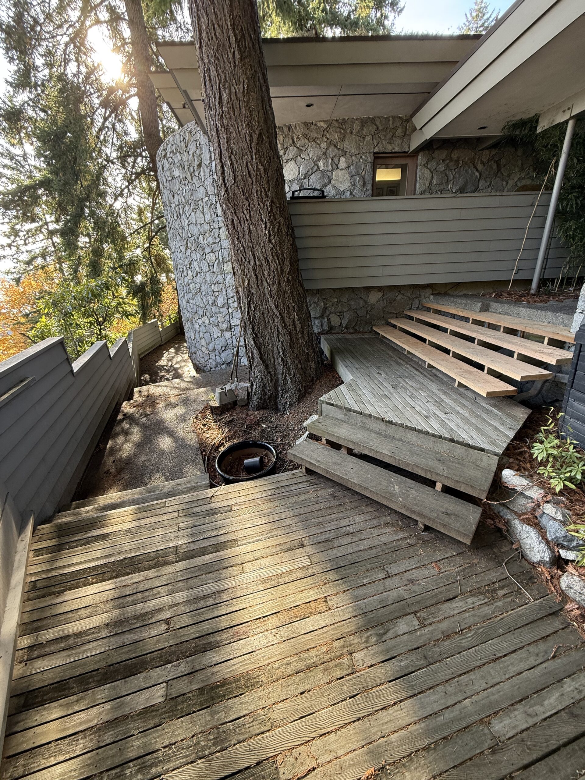 Old and rotted exterior stairs were carefully dismantled and rebuilt to restore safety and appearance. Damaged stringers were reinforced with new pressure-treated lumber, and all steps were replaced with solid fir planks sealed with an exterior-grade urethane finish for lasting protection. The finished stairs provide a stronger structure, smoother steps, and a refreshed look that stands up to Vancouver’s weather.
